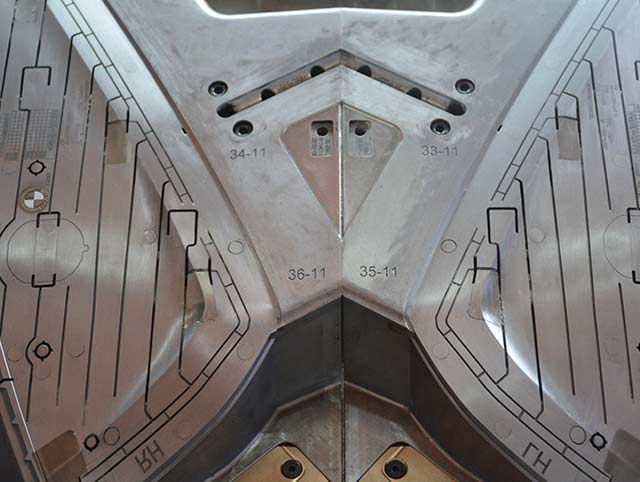 BMW end cap 1000T大型雙色模具,前模頂出需要開模同時(shí)沿分型面頂出,合模需要分型面推前模頂出系統(tǒng)回位,經(jīng)過我們工程團(tuán)隊(duì)前期跟客人提出的有效建議對(duì)產(chǎn)品的優(yōu)化,結(jié)果模具試模一次成功。